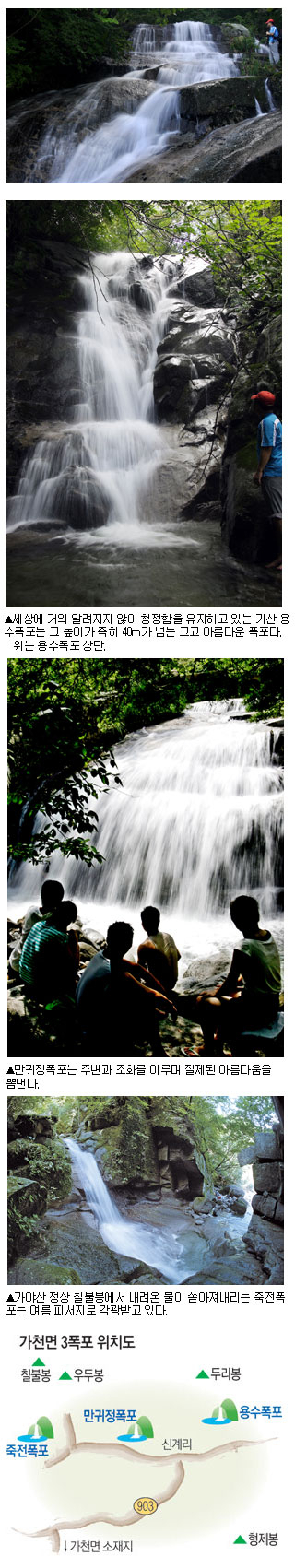 "아니 그런 폭포가 정말 있단 말입니까?" 김태봉 전 성주산악회장으로부터 가야산에 높이가 50m에 이르는 폭포가 있단 말을 듣고 믿어지지 않아 부지불식간 튀어나온 말이었다. 그런 폭포가 있다면 왜 사람들에게 진작 알려지지 않았을까란 의구심부터 생겼고, 성주군이나 가야산 국립공원관리사무소에서 만든 지도에서도 보지 못한 터였다.