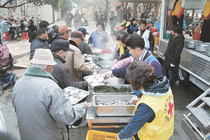 대한적십자사 대구지사와 보광병원 직원들로 구성된 봉사단 30여명은 26일 달서구 두류공원에서 노숙인과 노인 700여명을 대상으로 무료급식 및 건강상담 활동을 펼쳤다.