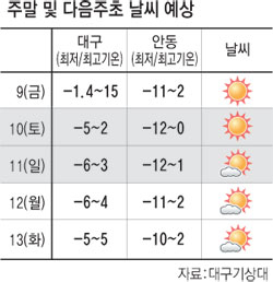 대구기상대에 따르면 토요일인 10일 대구 아침 최저기온이 영하 5℃로 예상되는 등 13일까지 영하 5, 6도 정도의 기온 분포를 보일 것으로 전망하고 있다. 낮 최고기온도 10일 2도로 떨어진 뒤 당분간 2~5도 분포를 보이겠다. 안동도 10, 11일 최저기온이 영하 12도로 예상되는 등 다음주까지 영하 10~11도 분포를 보이고, 최고기온도 0~3도에 머물 것으로 전망된다.