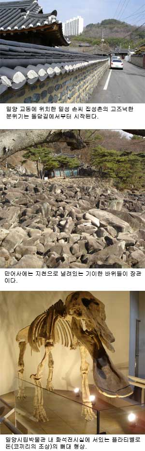 해발 674m의 만어산 8부 능선에 자리한 만어사는 가락국 수로왕이 창건했다는 삼국유사 기록이 있을 정도로 고 사찰이지만 정작 절 자체보단 신비한 현상으로 유명한 곳이다. 밀양의 3대 신비로 불리는 만어사 앞 바위숲이 그것이다. 이곳 바위의 3분의 2가량은 종소리나 쇳소리, 옥소리가 난다고 한다. 또 새벽녘 운해(雲海)는 신비감을 더해 준다. 하지만 기자 눈엔 이런 현상보다 '지천으로 수없이 널려있는 바위들이 도대체 어떻게 만들어졌을까'하는 궁금증이 더 컸다. 밀양시청 문화관광과 055)359-5641, 밀양시관광안내소 055)359-5582.