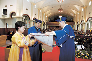 이화언(가운데) 전 대구은행장이 지난 27일 계명대에서 명예철학박사 학위를 받았다. 이날 계명대 아담스 채플에서 열린 학위 수여식에는 신일희 총장, 정순모 이사장, 배인호 총동창회장을 비롯해 하춘수 대구은행장, 대구상공회의소 이인중 회장 등 1천여명이 참석했다. 이 전 행장은 "그동안 해 온 일에 비해 너무 과분한 영광을 받는 것 같아 송구스럽다"며 "지역발전을 위한 소임을 앞으로도 꾸준히 해나갈 계획이며 무엇보다 계명대 동창회의 일원으로서 모교발전을 위해 최선을 다할 것"이라고 강조했다. 최창희기자 cchee@msnet.co.kr