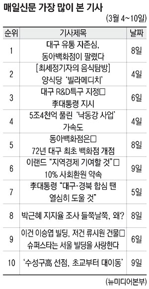 5, 6위는 각각 동아백화점 관련 기사. 5위는 동아백화점의 역사를 소개한 기사가, 6위는 이랜드측이 지역경제에 기여한다고 약속했다는 기사가 차지했다. 이명박 대통령이 대구를 방문해 대구경북이 한뜻으로 합심하면 정부에서도 적극 지원하겠다고 말했다는 기사가 7위에 올랐다.