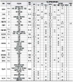 또한 고려대, 성균관대, 연세대 등 주요 대학들은 모집 정원의 50∼70%를 수능 성적만 반영해 우선선발하며, 경북대, 서울시립대, 중앙대 등 분할 모집 대학의 경우 특정 모집군에서 수능 100% 전형을 실시하고 있어 정시 모집에서 수능의 영향력은 절대적이다.(표참조)