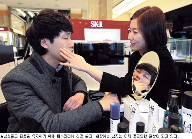 대백프라자 1층엔 남성화장품 전용매장이 있다. 황선영 매니저는 "이제 남성도 화장하는 시대"라며 "피부를 건강하게 유지 관리해주는 남성전용 BB크림이 인기"라고 말했다. 얼굴에 바르면 화장한 표시가 나는 '백탁현상'을 싫어하는 남성들이 많아 남성전용 BB크림은 화장한 표시가 나지 않고 모공 케어와 붉은 기(얼굴이 붉어지는 현상)를 눈에 띄지 않게 해주는 역할을 해 20, 30대 젊은 층은 물론 40, 50대 이후의 중장년층에게도 꾸준히 판매되고 있다는 것. 때마침 피부 관리를 받고 있던 장민영(29) 씨는 "요즘은 남자들도 피부관리에 부쩍 신경을 쓰고 있다"며 "회사원인 친구들이 원만한 대인관계는 물론 자신의 인사 관리를 위해 전문가들에게 정기적으로 관리를 받고 있는 등 남성 화장은 일반적인 현상으로 확산하고 있다"고 말했다.