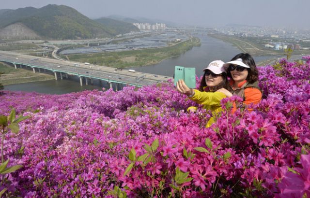 대구 서대구나들목 인근 와룡산에 영산홍 꽃이 만발해 분홍색 물감을 뿌린 듯 산을 붉게 물들이고 있다. 금호강과 어우러져 절경을 이룬 와룡산 영산홍은 고속도로와 인접해 대구를 찾는 외지인들과 시민들에게 인기를 끌고 있다.