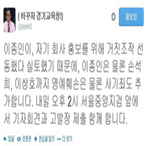 변희재 대표는 6일 자신의 트위터를 통해 "이종인 대표가 자기 회사 홍보를 위해 거짓조작 선동했다 실토했기 때문에, 이종인은 물론 손석희 JTBC 앵커, 이상호 고발뉴스 기자까지 명예훼손은 물론 사기죄도 추가한다"면서 "내일(7일) 오후 2시 서울중앙지검 앞에서 기자회견과 고발장 제출 함께 합니다"라고 알렸다.