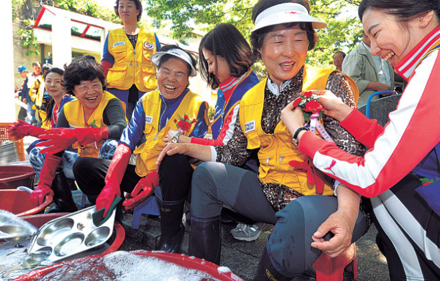 어버이날 카네이션을 준비한 이들은 자원봉사자들의 주름도 웃게 만들었다.