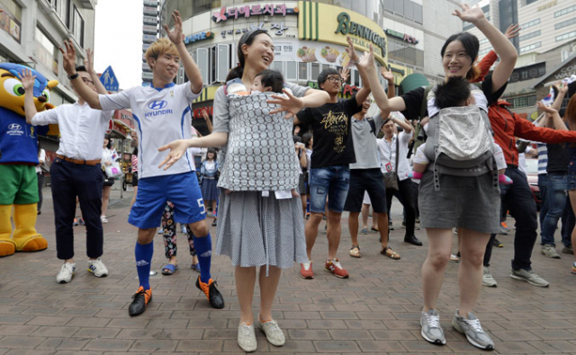 브라질 월드컵 개막을 나흘 앞둔 9일 대구 동성로에서 월드컵 공식 후원사인 현대자동차 월드컵 홍보단과 시민들이 국가대표팀 선전 기원 및 월드컵 붐 조성을 위한 플래시몹 댄스를 펼치고 있다.