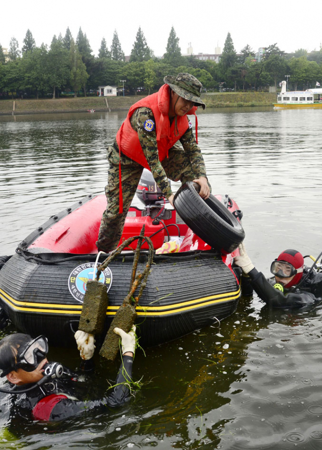 장마철을 맞아 6일 대한민국 특전동지회 대구지부 동구지회 회원 100여 명이 대구 동구 동촌유원지 금호강에서 수중 폐기물을 끌어올리는 등 유원지 일대 정화활동을 벌였다.