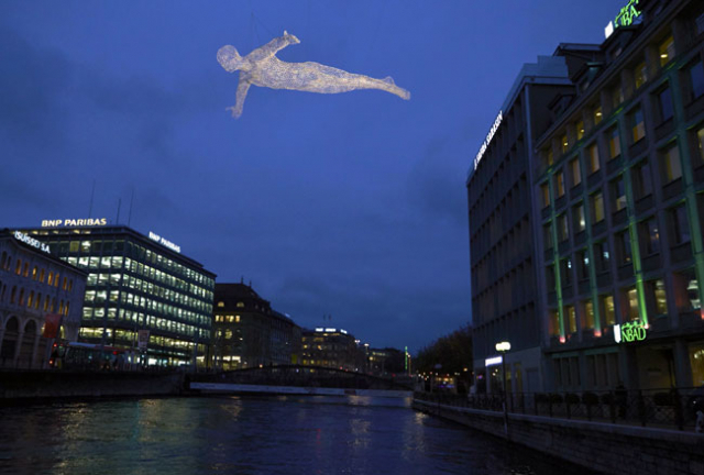 스위스 제네바의 밤하늘에 두 팔을 벌린 채 날아다니는 '여행자'가 나타나 광장을 내려다보고 있다. 프랑스 예술가 세드릭 르 보르뉴의 작품 '여행자들'이 제네바 벨 에흐 광장에 전시됐다. 작품은 제네바 빛 축제 출품작 중 하나로 내년 1월 11일까지 전시될 예정이다.