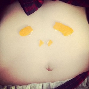 태연은 17일 자신의 인스타그램에 배 위에 귤 껍질이 올려진 사진을 올렸다. 귤 껍질이 놓인 위치와 배꼽의 구도가 마치 사람의 얼굴 표정 같아 웃음을 자아낸다.
