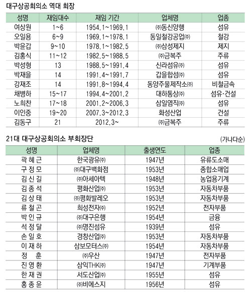 김 회장보다 나이가 어린 부회장은 구정모 ㈜대구백화점 대표, 김종석 평화산업㈜ 대표, 김상태 평화발레오㈜ 대표, 손일호 경창산업㈜ 대표, 이재하 삼보모터스㈜ 대표, 한재권 서도산업㈜ 대표, 홍종윤 ㈜비에스지 대표다. 이들 가운데 김 회장이 회장을 맡았던 2012년 당시 61세였던 점을 감안하면 이 나이 이하인 인물은 이재하'한재권'홍종윤 대표 등 단 3명이다.