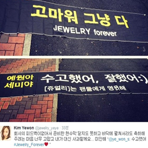 쥬얼리 출신 가수 예원은 지난 27일 오후 자신의 트위터에 "회사의 피드백이 없어서 준비한 현수막 달지도 못하고 바닥에 펼쳐서라도 축하해 주려는 마음 너무 고맙고 내가 대신 사과할게요. 미안해"라는 글과 함께 사진을 게재했다.