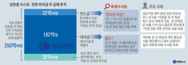 경남기업 관계자는 "검찰 직원들이 회사를 찾아와 내부 자료 등을 찾았다"며 "성 전 회장이 남긴 정치자금 리스트와 관련해 회계자료와 관련 컴퓨터 파일 등을 확인하기 위해 온 것으로 보인다"고 말했다.