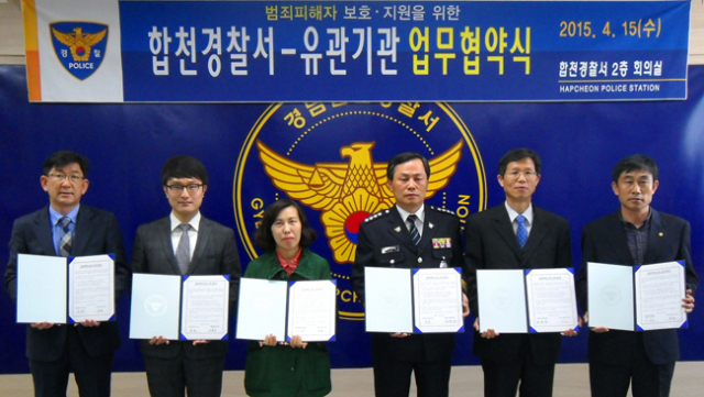 합천경찰서(서장 김균)는 15일 합천군청 주민복지과와 합천군보건소, 대한법률구조공단 합천지소, 범죄피해자지원센터 합천지구, 합천가정행복상담센터 등 5개 유관기관단체와 함께 피해자 보호지원 강화를 위한 업무협약을 체결했다.