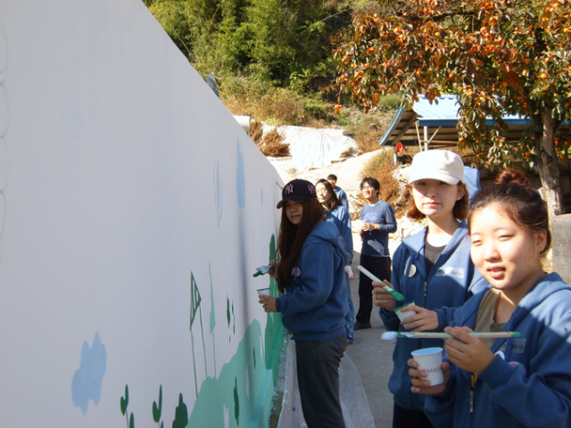 벽화는 30여m의 담에 건물과 책, 도서관 이미지와 초록빛 농촌의 정감을 함께 담았다. 관람객들이 사진을 찍을 수 있는 포토존도 마련됐다. 벽화 그리기를 담당한 김은미(29'경기도 부천) 씨는 "시간만 되면 이 마을의 다른 집에도 더 그려주고 싶다"며 "도시에서는 재능확산 운동으로 벽화작업 봉사가 많으나 시골은 그렇지 않은 것 같다"고 했다.