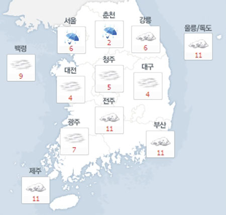 오전 예상 최저 기온은 서울 5도, 부산 6도, 대전 2도, 광주 6도, 대구 4도, 춘천 1도, 제주 11도 등으로 어제보다 높겠다.