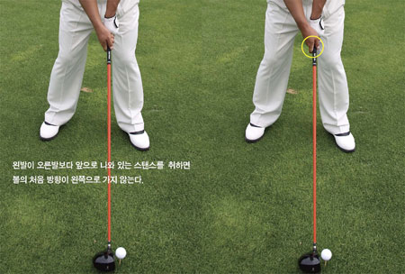 이렇게 인사이드에서 아웃사이드의 스윙 궤도를 만들지 못하며 볼이 타깃의 왼쪽으로 가는 샷을 할 때, 왼발을 오른발보다 앞쪽으로 내밀어 클로즈 스탠스를 취하고 샷을 해보자. 그래도 왼쪽으로 볼이 간다면 오른손 그립이 너무 과도하게 강한 그립이기 때문이다. 오른손을 중성 그립 내지 약한 그립으로 바꾸면 타깃의 왼쪽에 떨어지는 샷을 막을 수 있다.