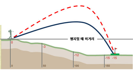 샷을 하면 출발 때 발생한 관성에 의해 앞으로 가지만 관성이 떨어지면 중력에 의해 땅으로 떨어진다. 오르막일 경우는 관성이 많이 남아있는 상태라 낮은 각도로 지면에 떨어지니 구르는 거리가 길어지고, 내리막의 경우는 앞으로 가는 관성은 낮아져 중력에 의해 높은 각도로 지면에 떨어진다. 그래서 표고차가 큰 내리막에서는 구르는 거리가 아주 적다. 자연과 싸우는 필드에서는 변수가 많지만 스크린골프에서는 이 공식이 잘 적용된다.