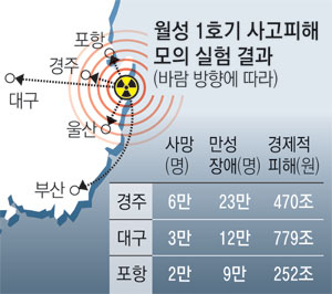 환경운동연합과 경주핵안전연대 등이 진행한 월성1호기 사고 피해 모의실험 결과에 따르면 지진에 의한 원전 사고 직후 경주로 바람이 불면 경주권 사망 6만 명, 만성장애 23만 명, 경제적 피해 470조원이 예상된다. 바람이 대구로 향하면 대구권 사망 3만 명, 만성장애 12만 명, 경제적 피해 779조원, 포항 쪽으로 바람이 불면 포항권 사망 2만 명, 만성장애 9만 명, 경제적 피해 252조원이 예측됐다.