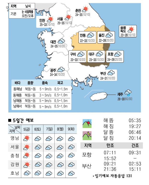 대구경북은 구름 많겠으며 당분간 낮 기온이 33℃ 이상 오르면서 무덥겠고, 밤 사이에도 열대야가 나타나는 곳이 있겠으니 건강관리에 유의 바람. 울릉도'독도 대체로 맑음.