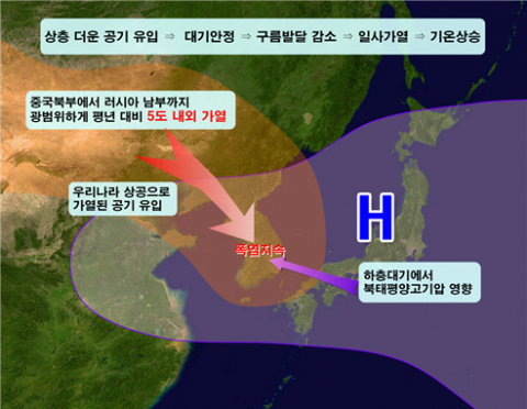 기상청은 최근 폭염의 가장 큰 원인은 북태평양고기압이 한반도 쪽으로 확장되면서 고온다습한 공기를 올려보내고 있기 때문으로 해석했다. 여기에다 중국 북부에서 유입되는 뜨거운 공기, 동풍을 타고 들어오는 기류의 영향이 겹치고, 스콜처럼 잠시 쏟아붓는 소나기를 제외하면 비도 거의 내리지 않으면서 전국 대부분 지역에서 기온이 쉽게 내려가지 않는 상황이 이어지고 있는 것이다.