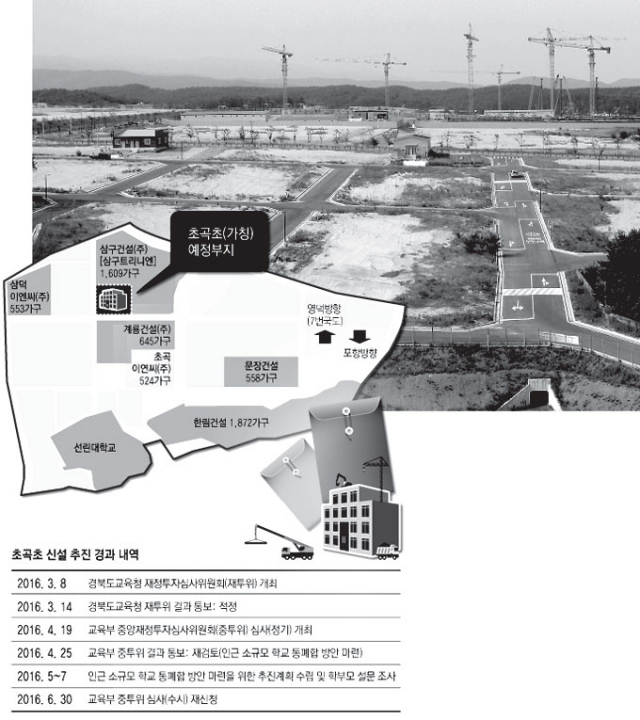 입주민들은 이 같은 초교 신설 계획을 일제히 환영했다. 초곡초 신설 계획은 곧바로 이어진 경북도교육청 재정투자심사위원회까지 통과했지만 한순간에 물거품이 됐다. 최종 결정 권한을 지닌 교육부 중앙재정투자심사위원회(중투위)가 지난 4월 25일 재검토 결정을 내린 것이다. 대신 중투위는 '인근 소규모 학교 통'폐합 방안 마련'을 요구했다.