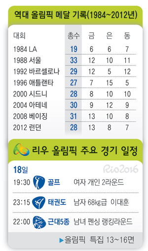 브라질에서 열리는 제31회 하계 올림픽에 참가 중인 한국은 17일 현재 금메달 6개, 은메달 3개, 동메달 5개에 머무르고 있다. 애초 목표한 '10-10'(금메달 10개 이상-종합순위 10위 이내)은 사실상 물 건너간 상태다. 1984년 로스앤젤레스 올림픽 이후 32년 만에 전체 메달 수가 20개 이하로 떨어질 수도 있다.