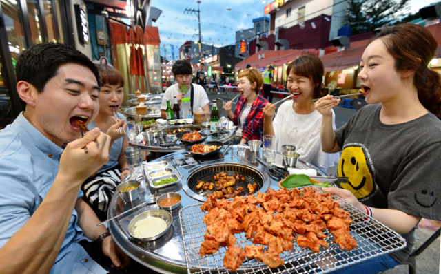 막바지 한여름밤의 열기를 식혀줄 먹거리 축제가 대구에서 열렸다. '2016 안지랑골 곱창 축제' 가 개막한 25일 오후 남구 대명동 안지랑 곱창골목에서 시민들이 곱창의 구수한 풍미를 느끼며 시식하고 있다. 대구 남구청과 안지랑골 곱창상가번영회가 주최한 이번 축제는 27일까지 열린다.