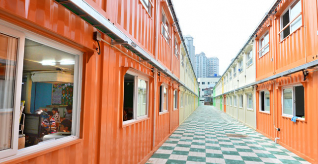5일 오후 1시 30분 대구 수성구 동천초등학교. 운동장에 들어서자 주황색, 노란색 등 형형색색의 컨테이너로 된 2층짜리 임시 교사가 눈에 띄었다.