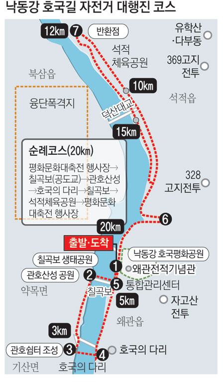 자전거 행렬이 지나는 각각의 호국 전적지에는 역사적 사실에 대한 설명이 담긴 패널이 설치되고, 칠곡보 공도교에는 451m 길이의 6'25전쟁 이야기가 담긴 스토리 보드가 설치돼 6'25전쟁 영화 한 편을 본 듯한 감동을 줄 계획이다. 자전거 대행진 코스는 칠곡보 생태공원~칠곡보 공도교~관호산성~호국의 다리~303고지~328고지~칠곡보 생태공원을 잇는 20㎞ 구간이다. 노약자들을 위한 5㎞ 구간도 운영된다.