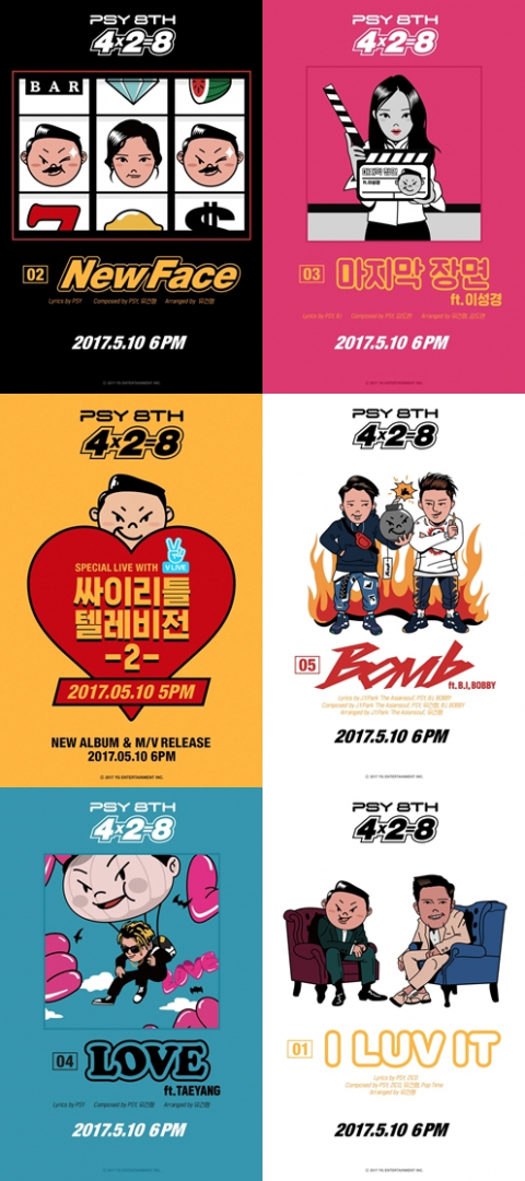 9일 YG엔터테인먼트는 공식 블로그(www.yg-life.com)를 통해 싸이의 신곡 'I LUV IT', 'New Face', '마지막 장면', 'LOVE', 'BOMB'의 일러스트 티저 포스터 5종을 동시 공개했다.