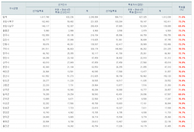 선거인수의 (우편 + 관내사전투표) : 사전투표자수+(거소+선상+재외투표신고인수), 투표자수의 (우편 + 관내사전투표) : (관외사전+거소+선상+재외투표 접수수)+관내사전투표자수