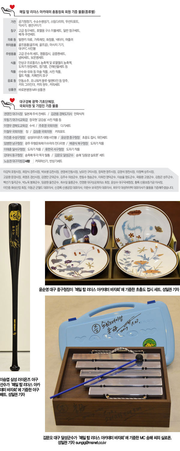 매일 탑 리더스 아카데미 바자회는 16일 오후 5시부터 9시까지 대구 수성구 아리아나호텔에서 진행된다. 메인 이벤트인 경매는 오후 7시에 시작할 예정이다. 사회는 개그맨 남희석 씨와 방송인 설수진 씨가 맡았다.