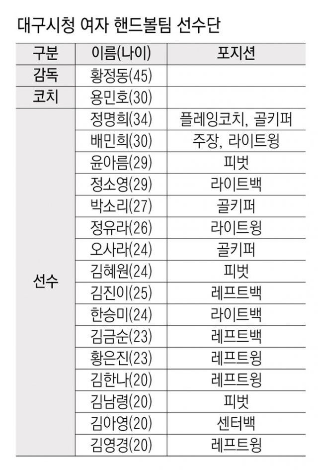 1984년 창단한 대구시청 여자 핸드볼팀은 황정동(45) 감독을 비롯해 용민호(30) 코치, 선수 16명 등 모두 18명으로 구성돼 있다.