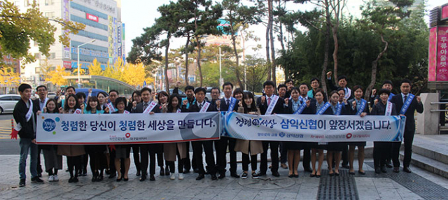 삼익신협이 8일 대구 달서구 두류역에서 국민건강보험공단 대구달서지사와 함께 청렴 문화 확산을 위한 '반부패'청렴실천 캠페인'을 실시했다. 이날 캠페인에서 삼익신협 직원들은 청렴 의식 제고 및 반부패 청렴 실천 의지를 다짐하고, 두류역을 오가는 직장인 및 지역민들을 대상으로 청렴 메시지가 담긴 핫팩과 전단을 나눠주며 홍보활동을 펼쳤다.