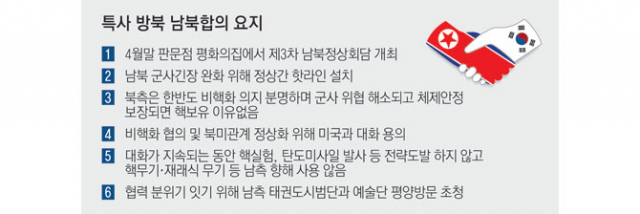 정의용 청와대 국가안보실장을 수석특사로 한 특사단은 서해 직항로를 거쳐 6일 오후 5시58분쯤 성남 서울공항에 도착한 뒤 청와대 춘추관으로 이동, 청와대 출입기자들 앞에서 6개항에 이르는 남북 합의 내용을 발표했다.