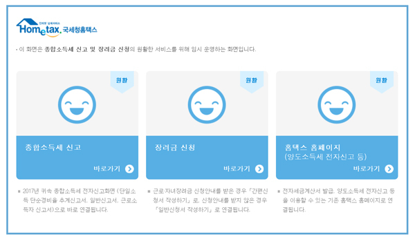 1일 국세청 홈텍스 홈페이지 접속시 '이 화면은 종합소득세 신고 및 장려금 신청의 원활한 서비스를 위해 임시 운영하는 화면입니다.'라는 문구와 함께 '종합소득세 신고' '장려금 신청' '홈텍스 홈페이지(양도소득세 전자신고 등)'이라는 3개 접속 통로 메뉴가 뜬다. 또한 3개 메뉴에서 연결되는 웹사이트의 접속 상태를 표시하고 있다. 1일 오후 3시 기준 3개 메뉴 모두 '원활'이다.