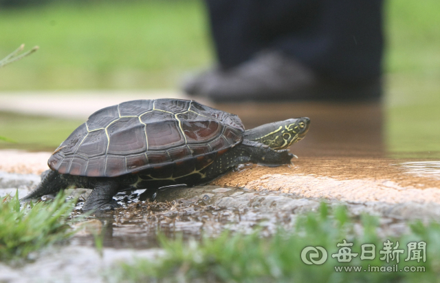 3일 오후 대구에 한때 소나기가 내리자 신천에 서식중인 거북 한 마리가 둔치 위로 올라와 우중 산책을 즐기고 있다.