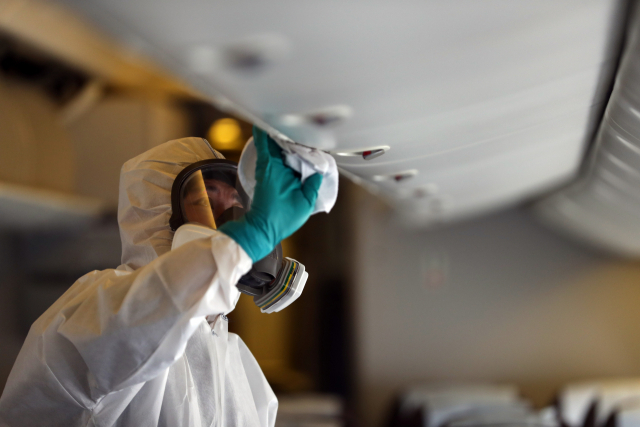 13일 오후 대한항공 인천 정비 격납고에서 관계자들이 중동호흡기증후군(MERS·메르스) 예방을 위해 두바이발 대한항공 항공기 소독 작업을 하고 있다.
