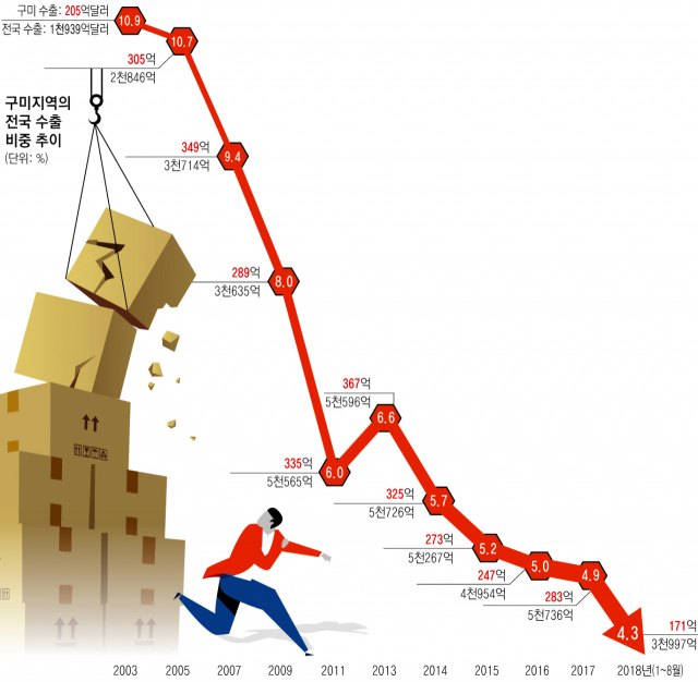 구미의 전국 수출 비중은 2005년 10.7%에서 2007년 9.4%, 2009년 8%, 2010년 6.0%, 2014년 5.6%, 지난해 4.9%로 계속 감소하고 있고, 올 들어선 4.3%대로 급락했다.
