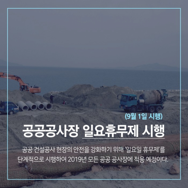 정부가 공공 건설공사 현장의 안전을 강화하기 위해 9월부터 일요일 휴무제를 단계적으로 적용한다. 내년 상반기부터는 모든 공공사업에 의무 적용한다는 계획이다. 다만 재해복구나 우천 등 불가피한 경우는 발주청의 사전 승인 후 공사를 허용할 계획이다.