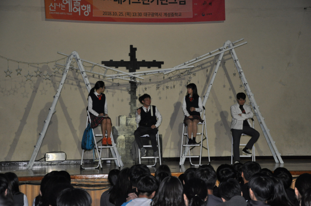 계성중학교(교장 장욱)는 25일 5~7교시에 1,2학년 학생들을 대상으로 청소년 진로탐색 토론연극 '내가 그린 기린 그림'(극단 해(解)의 찾아가는 공연)'을 관람하며, 토론 한마당 프로그램을 진행했다.