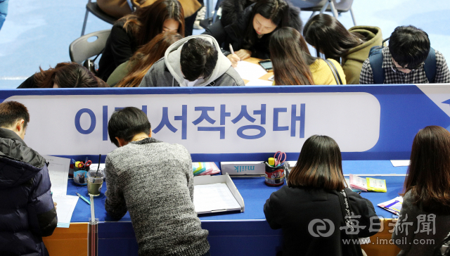 1일 계명대학교 성서캠퍼스에서 열린 '청년·중장년 다함께 2018 잡매칭 한마당'에서 구직자들이 이력서를 작성하고 있다.