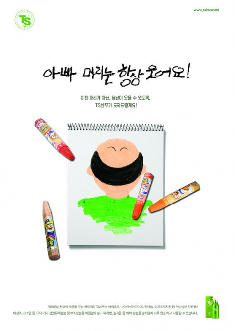 아이가 적은 삐뚤빼뚤한 글씨의 '아빠 머리는 항상 웃어요!'라는 카피 한 줄과 아이가 그린 아빠의 뒷모습을 배치하여 더욱 간결하고 명료하게 작품을 담아내고자 했습니다.