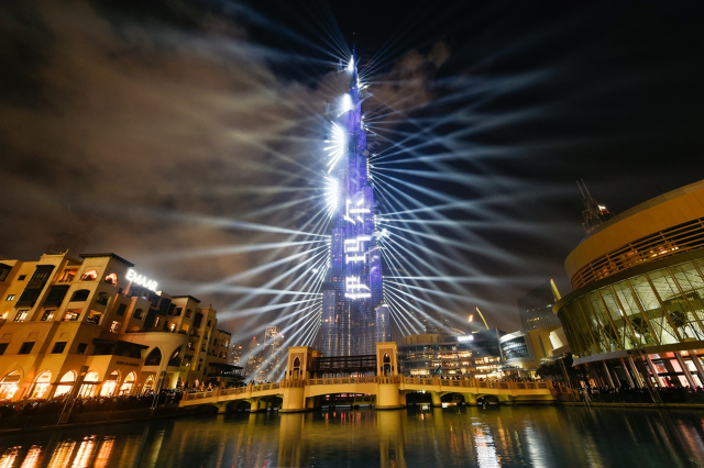 1일(현지시간) 아랍에미리트(UAE) 두바이의 세계 최고층 빌딩 부르즈 칼리파에서 화려한 새해맞이 불꽃축제가 펼쳐지고 있다. 연합뉴스