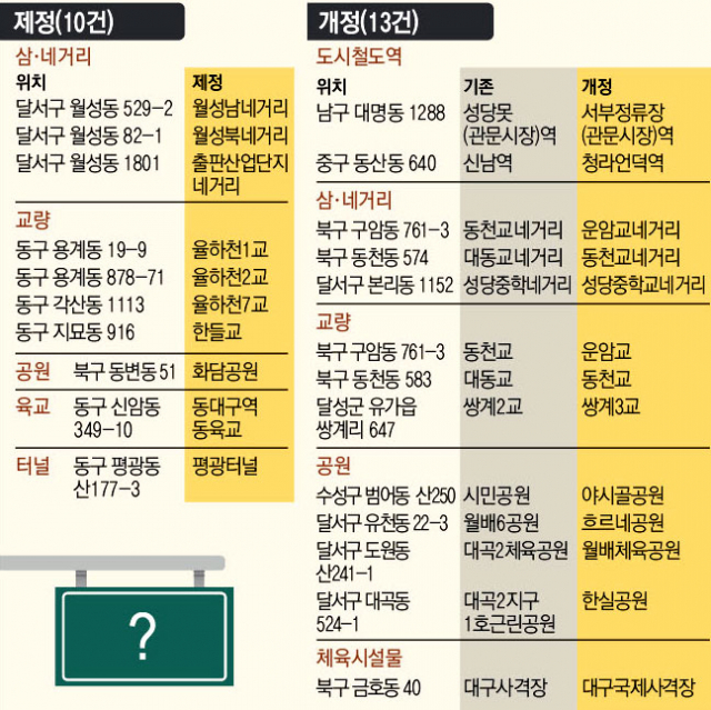 대구시 관계자는 "제·개정이 확정된 공공용물은 해당 구·군과 대구도시철도공사 등에서 새로운 명칭에 맞춰 시설물을 정비할 예정"이라고 했다.
