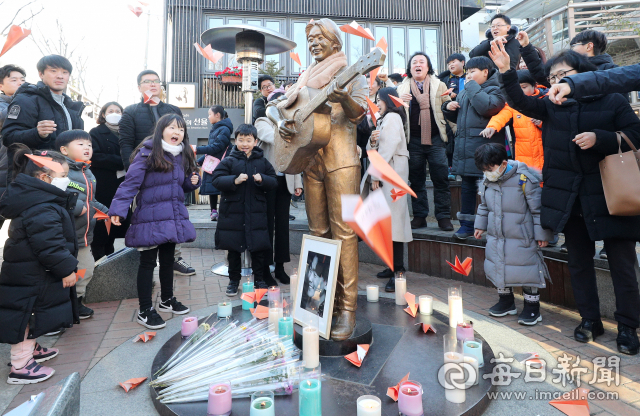 가수 김광석 타계 23주기인 6일 오후 대구 중구 김광석 거리에서 추모콘서트가 열린 가운데 팬들이 김광석을 추모하는 글을 적은 종이비행기를 날리고 있다.