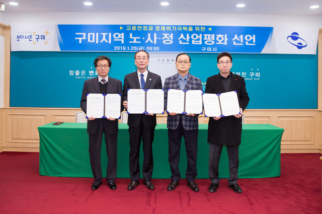 장세용 구미시장, 이승관 고용노동부 구미지청장, 고병헌 경북경영자총협회장, 김동의 한국노총 구미지부 의장을 비롯한 구미의 근로자, 기업인 등 50여 명은 25일 구미시청에서 산업평화를 위한 공동선언문을 채택하고 실천을 결의했다.