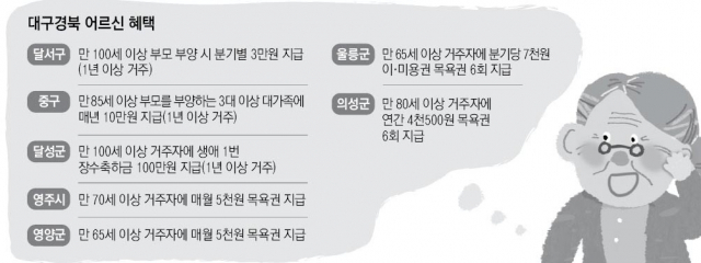 달성군청은 지난 2015년부터 군 내에 거주하는 100세 이상 노인에게 100만원(생애 한 번)의 '장수 축하금'을 지급한다. 매년 수혜자가 발생하는데 지난해에도 만 100세가 된 어르신 네분이 축하금을 받았다. 대구 중구청도 85세 이상 부모와 함께 생활하는 3대 이상 거주 가정에 매년 10만원 '효행장려금'을 지급하고 있다.